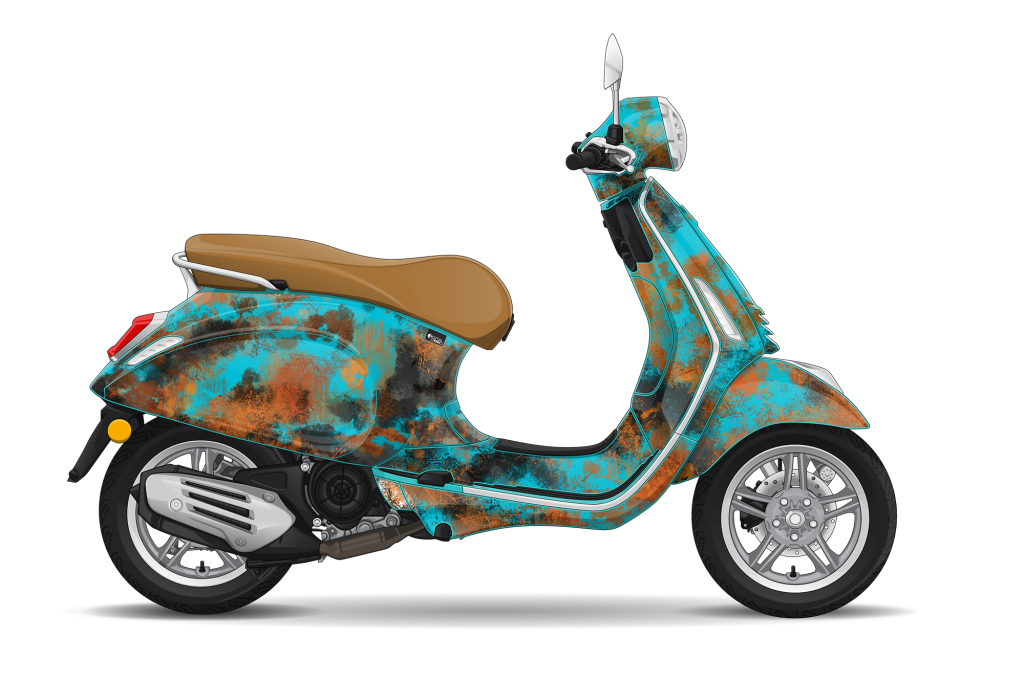 Această grafică are farmecul lucrurilor care spun o poveste. Turcoazul vibrant, îmbrăcat în texturi vintage și accente ruginite, dă senzația de aventură cu stil retro. Este genul de look care pare descoperit într-un garaj cool, dar gata să cucerească orașul. Perfect pentru cei care iubesc vibe-ul autentic, cu un strop de nonconformism. 🛵✨
