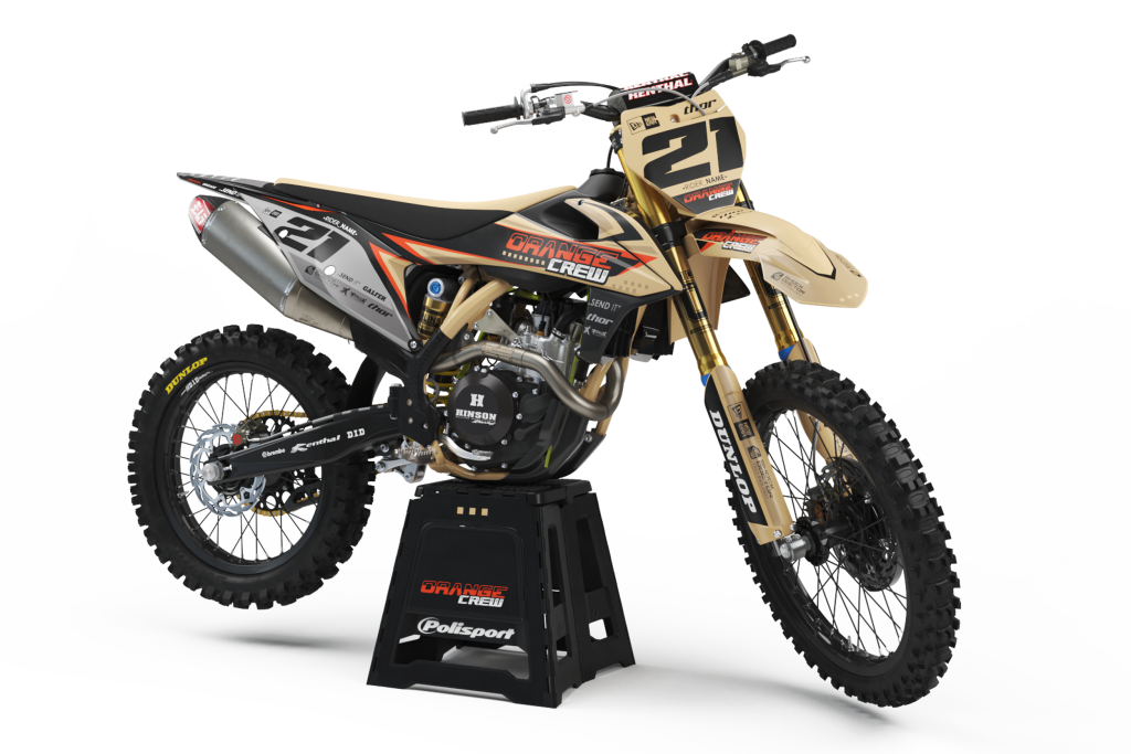 Motocross: placa din fata a motocicletei, pentru numere, precum si carenele de la evacuare